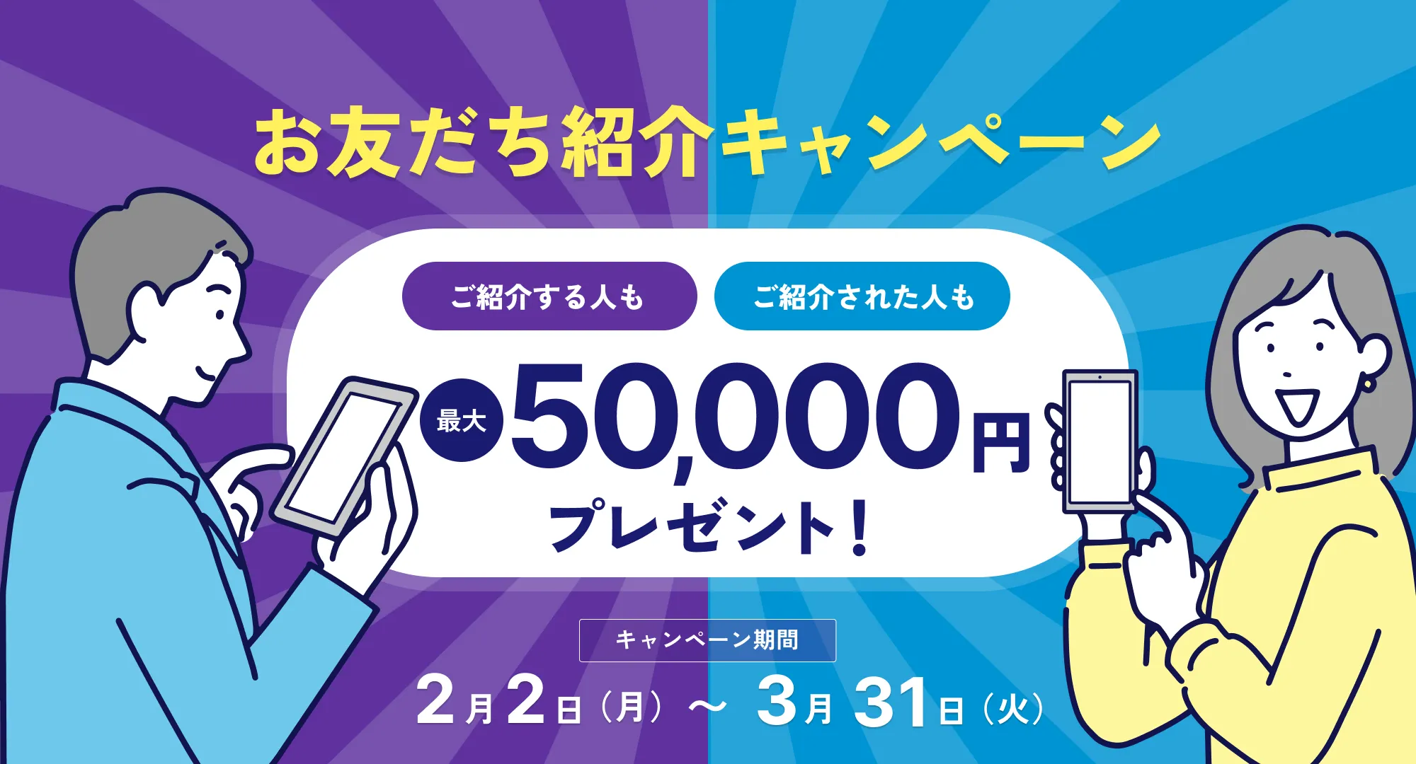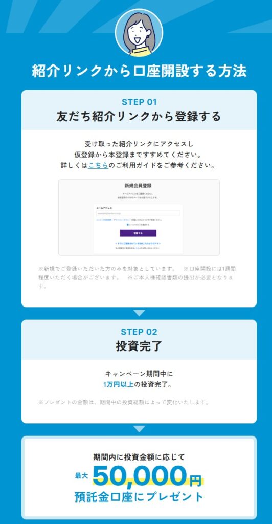 | 招待される人(被紹介者) | 紹介リンク経由で新規口座開設し、期間内に投資完了(投資総額に応じて金額が変動) | 明確な記載なし | 最大50,000円(預託金口座へ入金) |