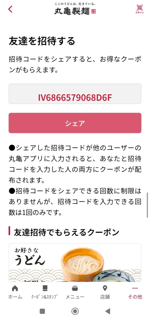株式会社丸亀製麺の運営する飲食店『丸亀製麺』の公式アプリには「友達招待(招待コード)」の仕組みがあります。