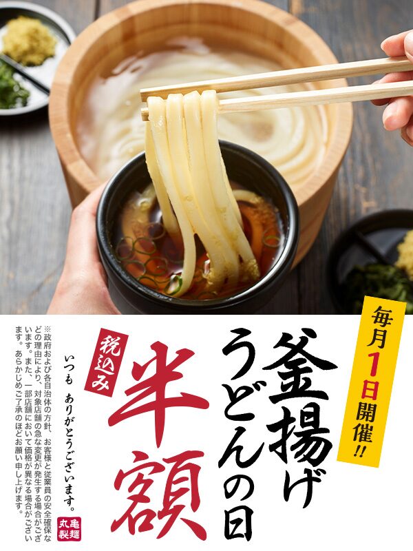 丸亀製麺の「1日」は釜揚げうどんが半額になる