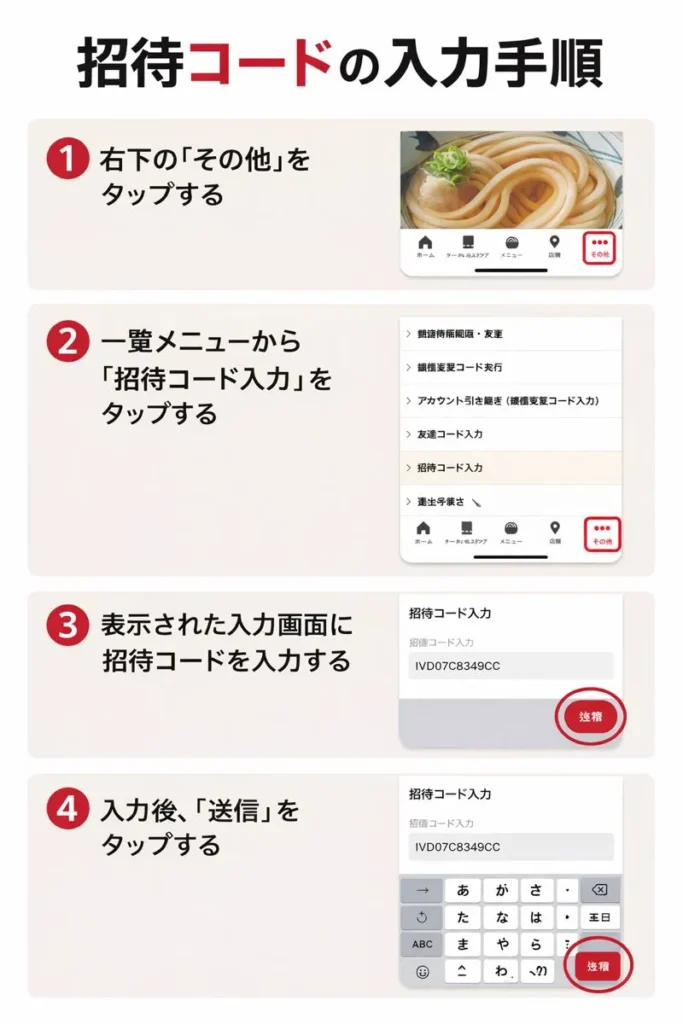 招待コードは、丸亀製麺公式アプリの「友達を招待する」機能で表示される英数字コードです。