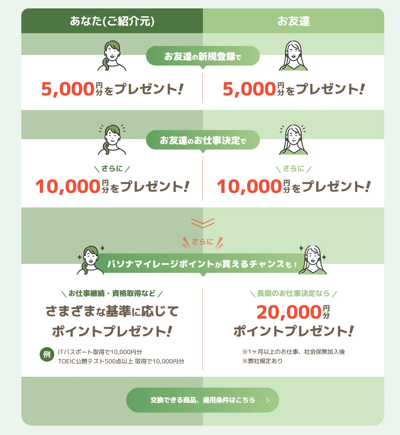 本キャンペーンは、パソナに登録している方から紹介を受けることで、 紹介した方・紹介された方の双方が特典を受け取れる制度です。