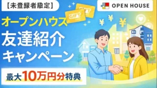 広告【未登録者限定】オープンハウスの友達紹介キャンペーン|最大10万円分の特典あり オープンハウスの友達紹介キャンペーンを解説。紹介URLから登録するだけで1,000円分、住宅購入・決済完了で最大10万円分のギフトカードがもらえます。対象条件・注意点・申込み手順をまとめました。 2026.01.04広告