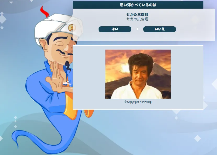 第57回はセガ・エンタープライゼスの家庭用ゲーム機であるセガサターンの宣伝マスコット(イメージキャラクター)のせがた三四郎1でアキネイターをプレイしてみました。