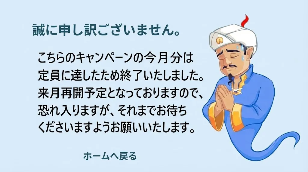 こちらのキャンペーンは定員に達しました X Facebook はてブ LINE コピー 2026.01.172026.02.03広告(advertisement) こちらのキャンペーンの今月分は定員に達したため終了いたしました。 来月再開予定となっておりますので、 恐れ入りますが、それまでお待ちくださいますようお願いいたします。🙇 ※キャンセルがあった場合は再開します。 ▶ トップページに戻る