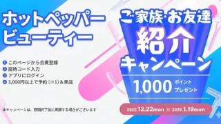 広告【招待コードあり】2025年12月ホットペッパービューティーの会員登録キャンペーン ホットペッパービューティーの友達紹介キャンペーンで1,000円分のポイントがもらえる!このページ限定の招待コードを使って、お得にサロン予約を始めよう(7/7まで) 2025.12.27広告