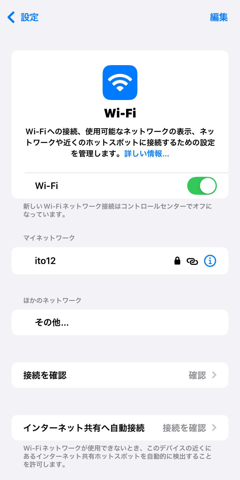 次に、親機のネットワークを利用したいiPhoneで、Wi-Fi接続の設定を行います。
