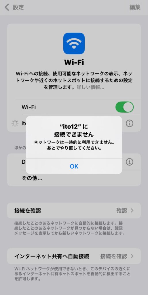 - 『ネットワークは一時的に利用できません。』と表示され、Wi-Fiが使用できない。